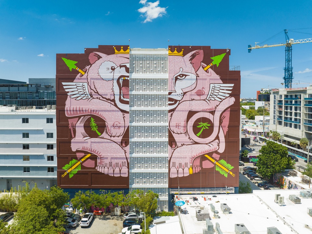 This piece was inspired by the official state animals from where I live, and where I painted this mural. Both the California Grizzly and The Florida Panther became endangered during man’s expansion in to their native turf. I thought it was a larger than life way to celebrate these majestic beasts and their struggle with humans. The property owners requested a design that created a connection between San Francisco California and Miami Florida.